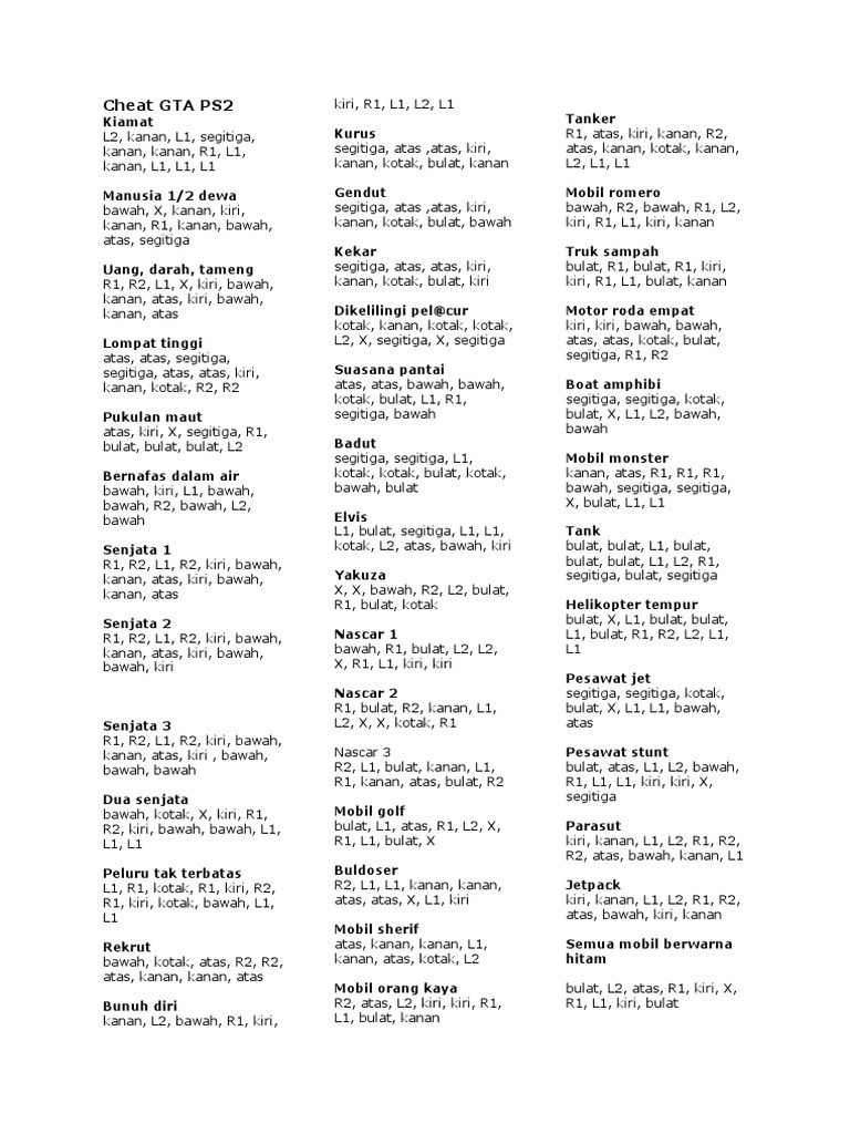 Cheat GTA PS2 kiri, R1, L1, L2, L1