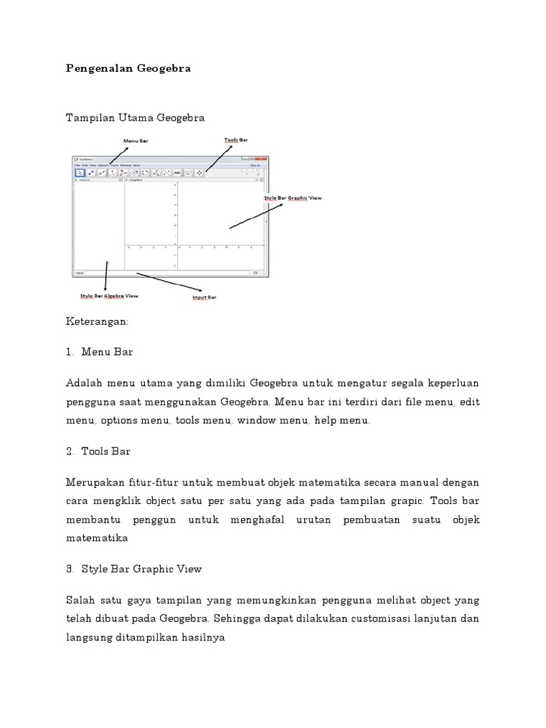 Pengenalan lebih lanjut mengenai Menu Bar Geogebra adalah sebagai berikut;