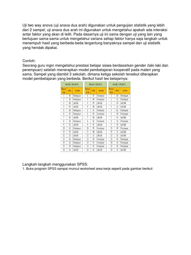 Uji two way anova (uji anava dua arah) digunakan untuk pengujian statistik yang lebih