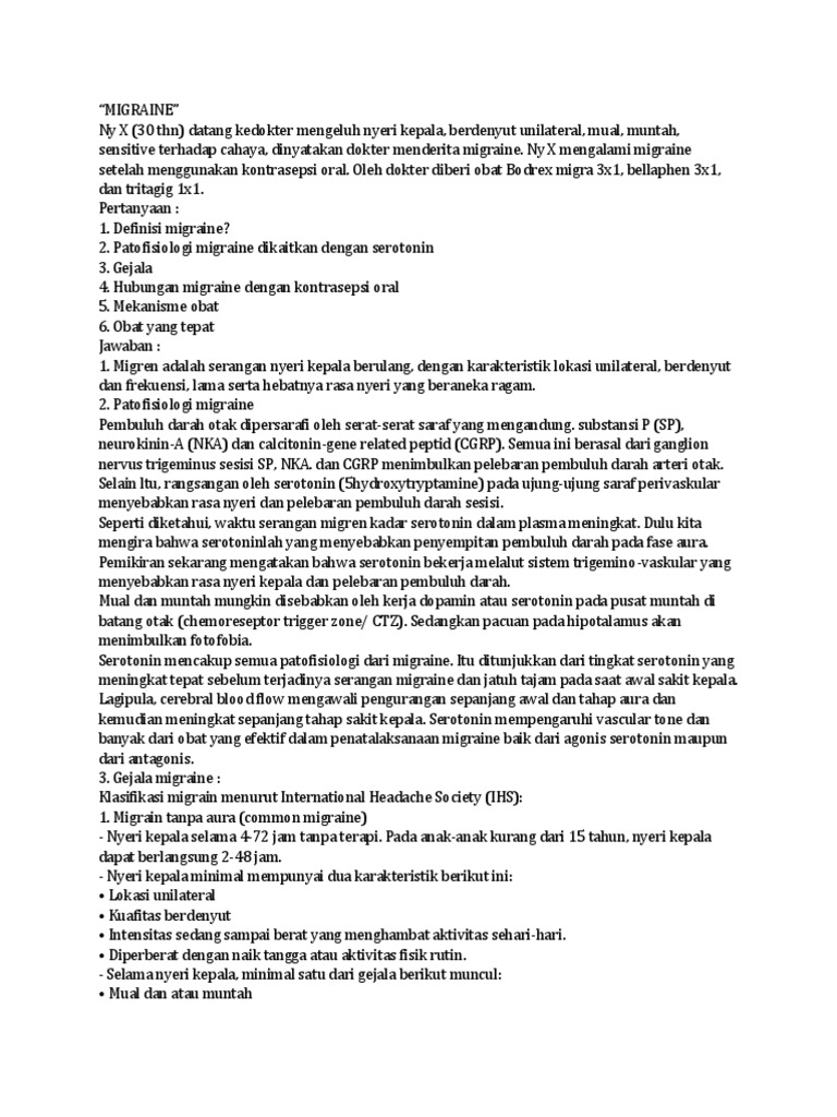 Ny X (30 thn) datang kedokter mengeluh nyeri kepala, berdenyut unilateral, mual, muntah,