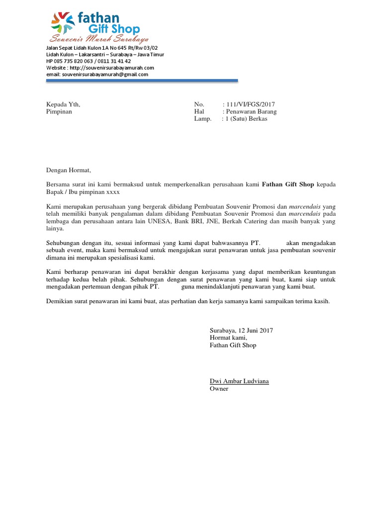 Bersama surat ini kami bermaksud untuk memperkenalkan perusahaan kami Fathan Gift Shop kepada