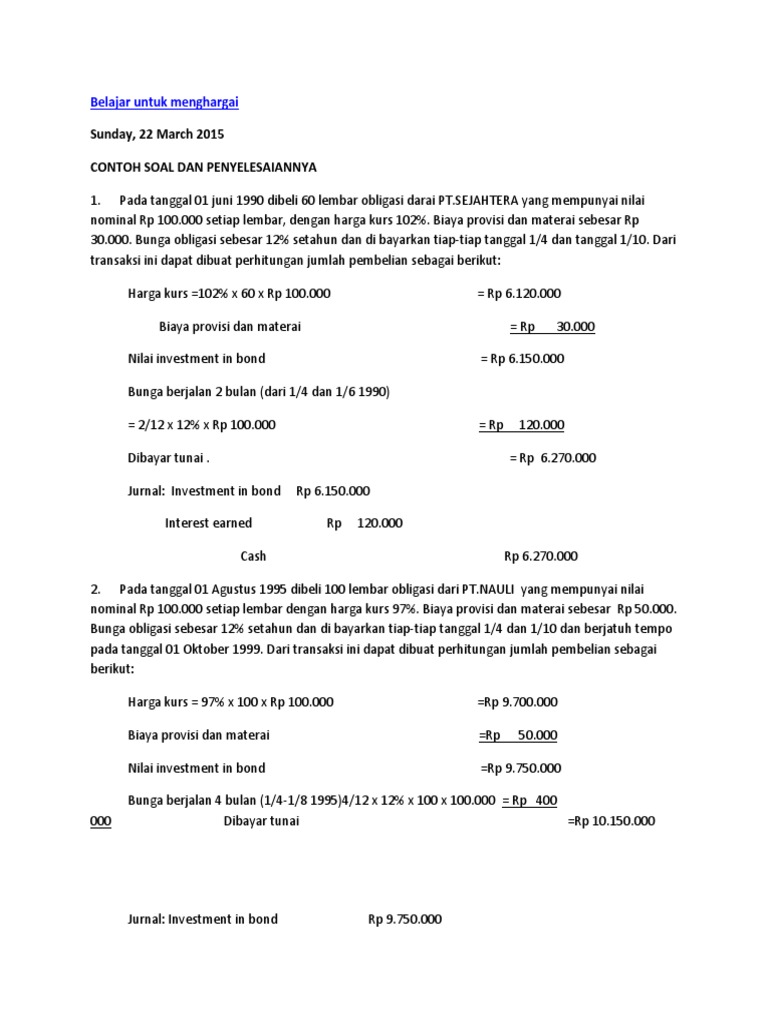1. Pada tanggal 01 juni 1990 dibeli 60 lembar obligasi darai PT.SEJAHTERA yang mempunyai nilai