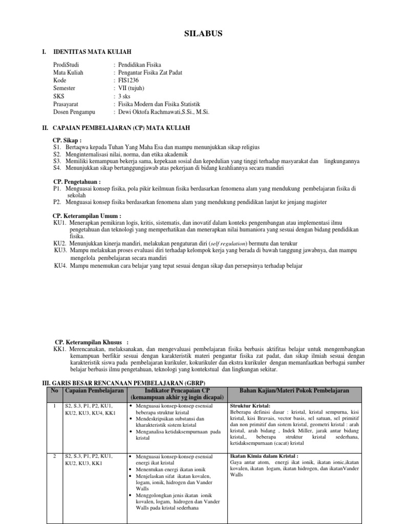 Silabus Pengantar Fisika Zat Padat