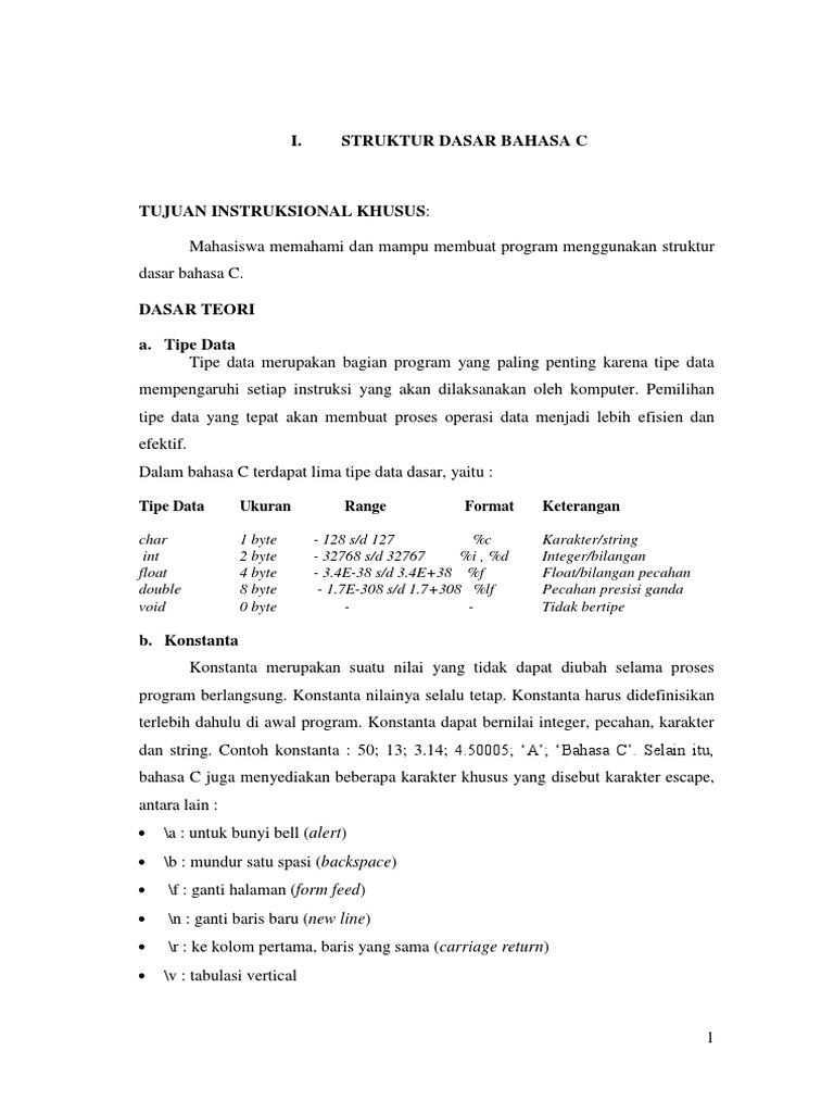 dan string. Contoh konstanta : 50; 13; 3.14; 4.50005; A; Bahasa C. Selain itu,