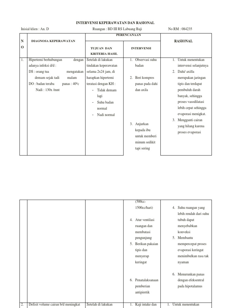 adanya infeksi d/d : tindakan keperawatan badan intervensi selanjutnya