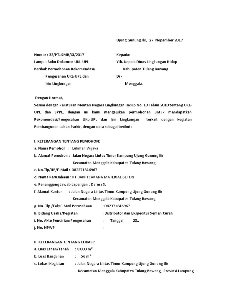Lamp. : Buku Dokumen UKL-UPL Yth. Kepala Dinas Lingkungan Hidup