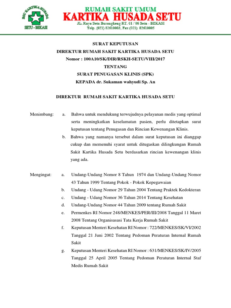 keputusan tentang Penugasan dan Rincian Kewenangan Klinis.