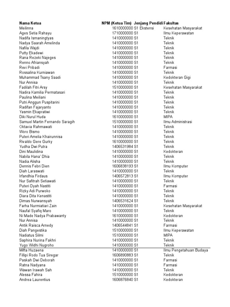 Nama Ketua NPM (Ketua Tim) Jenjang Pendidi Fakultas