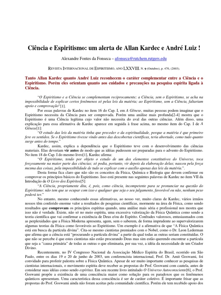 [9] A. F. da Fonseca, Revista Internacional de Espiritismo, março, p. 93 (2003).