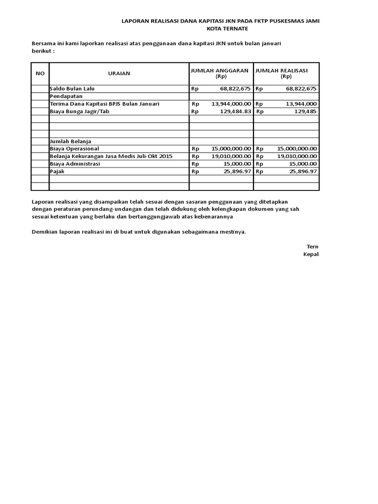 Bersama ini kami laporkan realisasi atas penggunaan dana kapitasi JKN untuk bulan januari