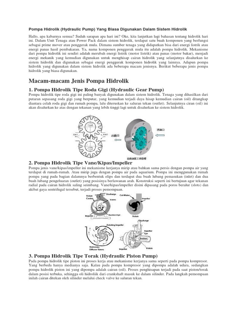 hidrolik yang digunakan dalam sistem hidrolik ada beberapa macam jenisnya. Berikut beberapa jenis pompa