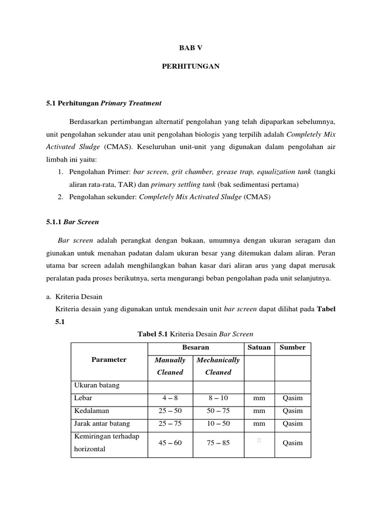 Kriteria desain yang digunakan untuk mendesain unit bar screen dapat dilihat pada Tabel