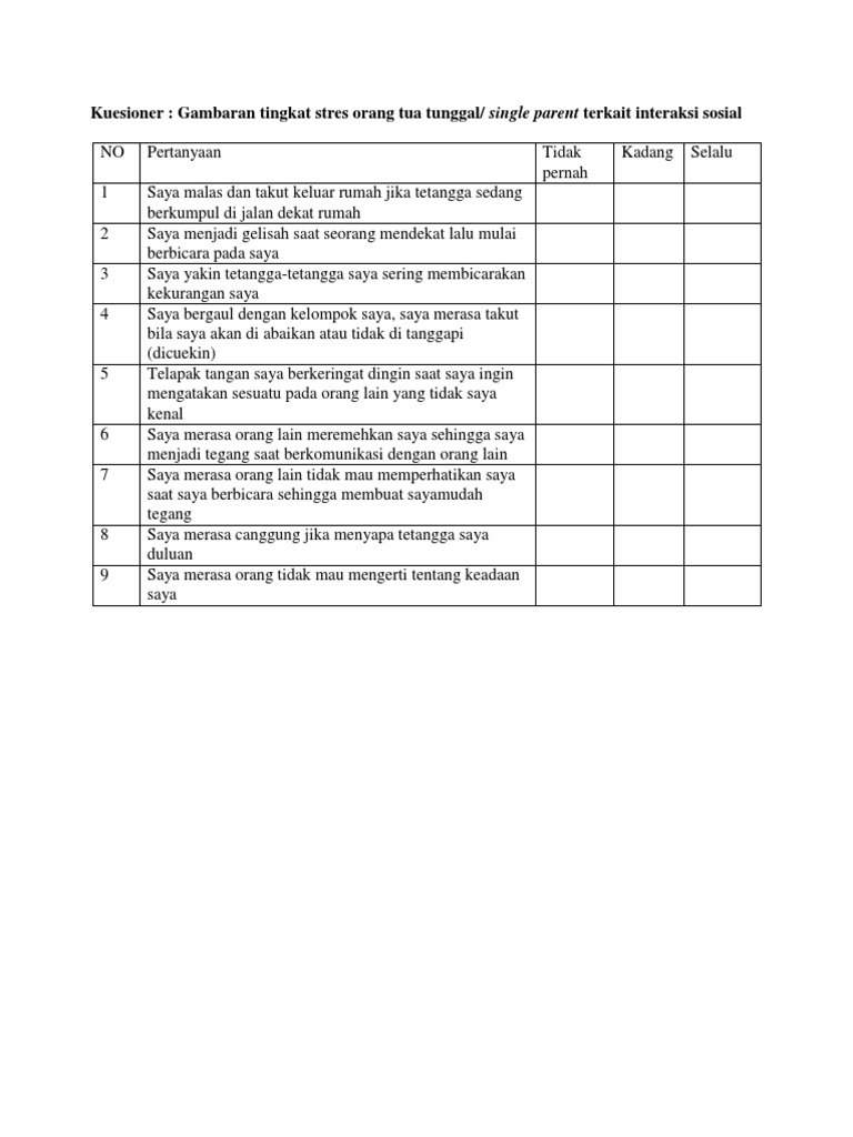 Kuesioner : Gambaran tingkat stres orang tua tunggal/ single parent terkait interaksi sosial