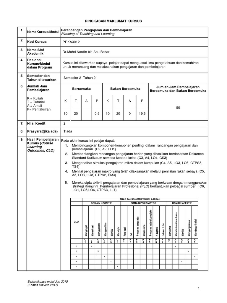 Kerangka Kursus/Modul dan Jumlah Jam Pembelajaran