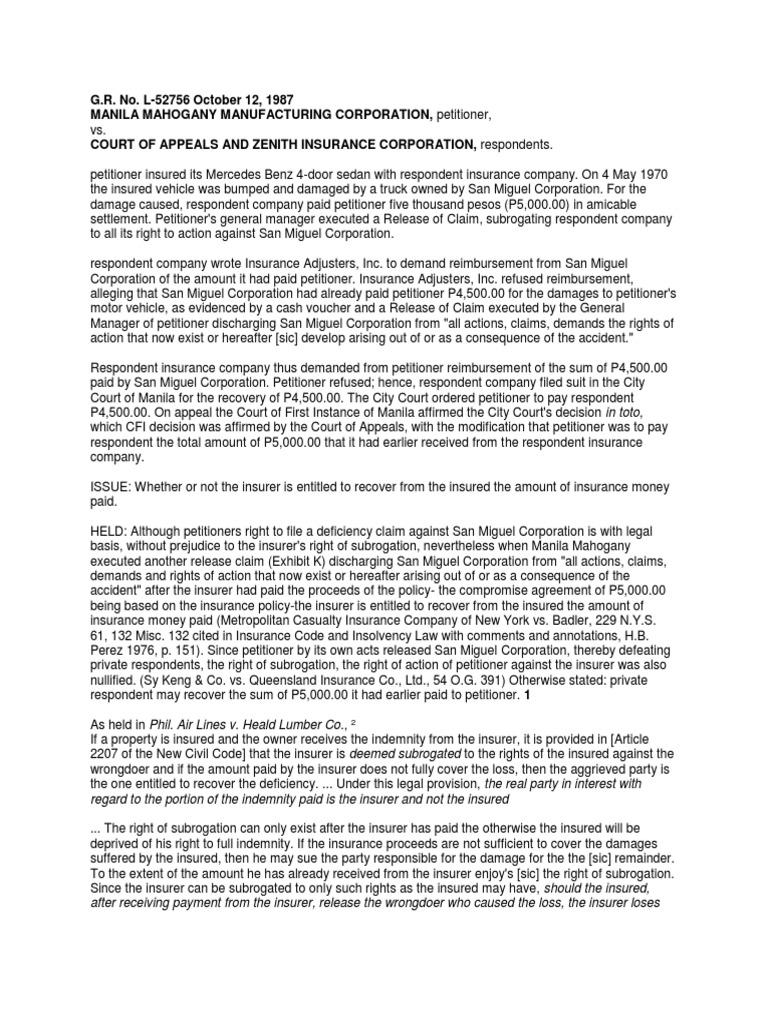 basis, without prejudice to the insurer's right of subrogation, nevertheless when Manila Mahogany