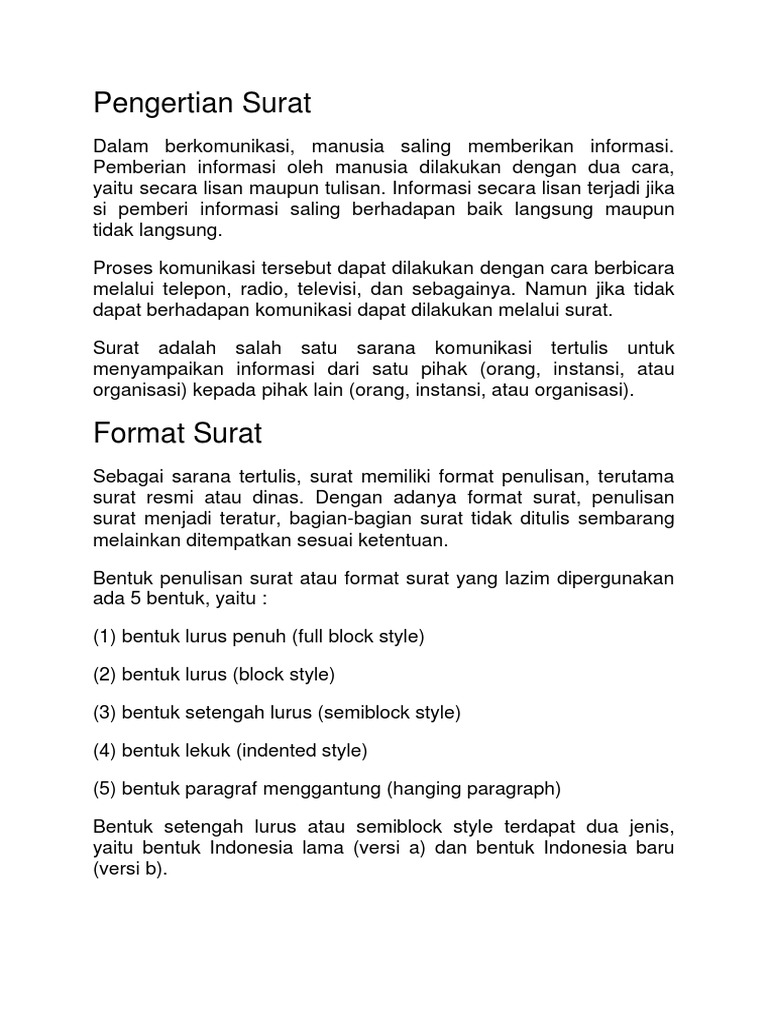 Bentuk penulisan surat atau format surat yang lazim dipergunakan