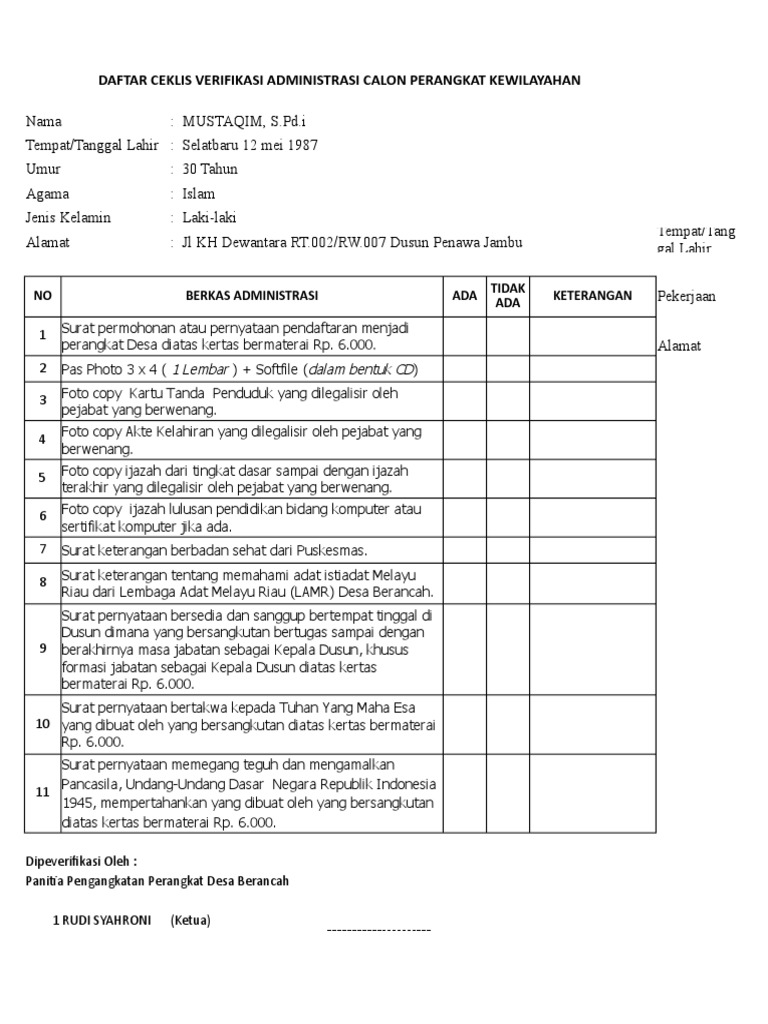 DAFTAR CEKLIS VERIFIKASI ADMINISTRASI CALON PERANGKAT KEWILAYAHAN