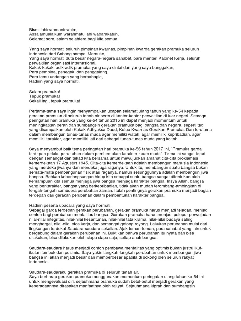 Hadirin sekalian, anak-anakku, kakak-kakak, adik-adik anggota gerakan pramuka yang saya