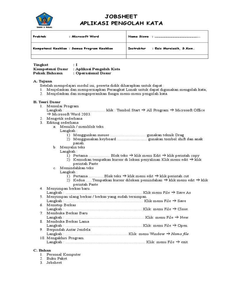 1. Menjelaskan dan mempersiapkan Perangkat Lunak untuk dapat digunakan mengolah kata;