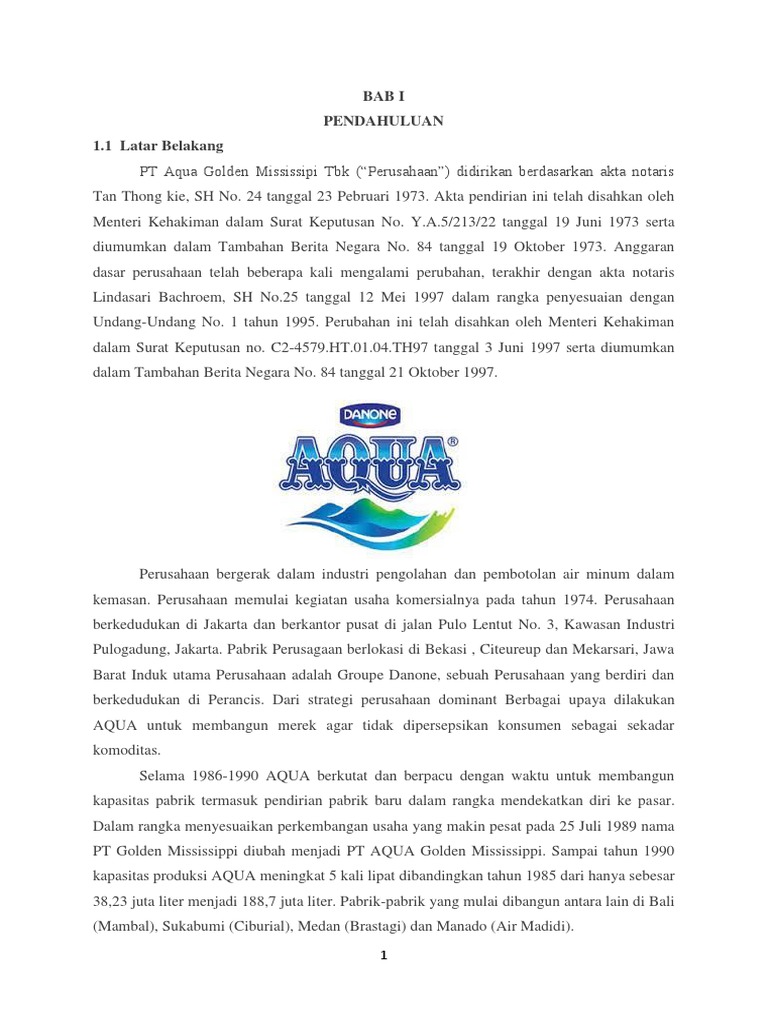 PT. Aqua Golden Mississippi di Indonesia sejak tahun 1973. Selain di Indonesia, Aqua juga