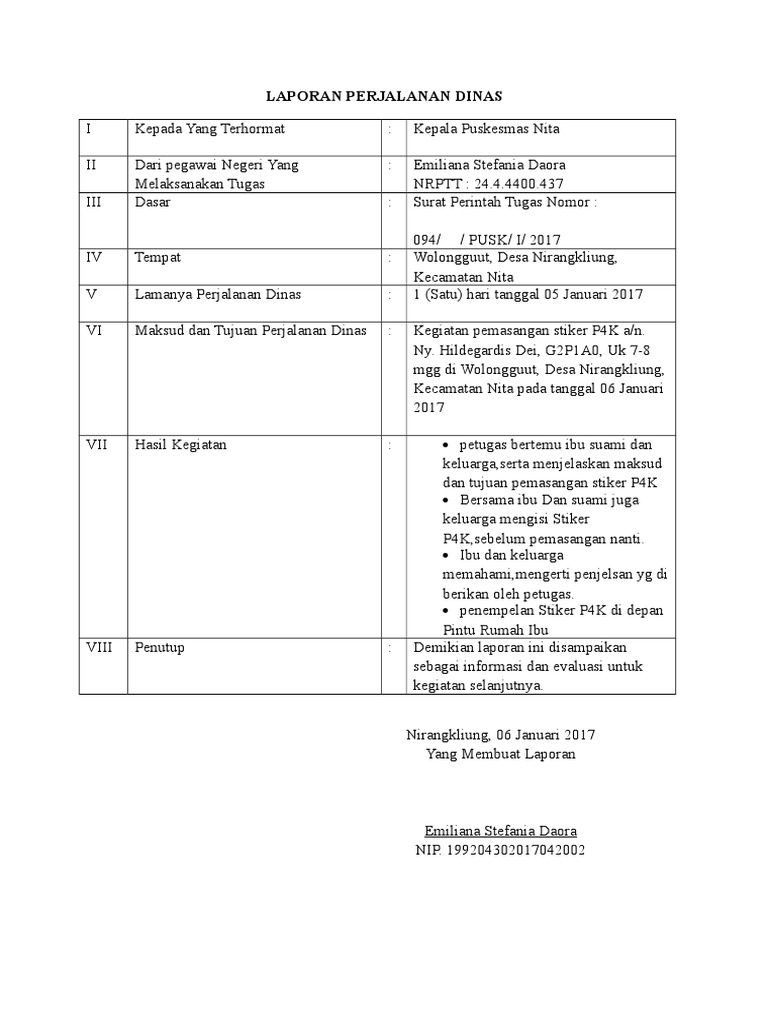 VI Maksud dan Tujuan Perjalanan Dinas : Kegiatan pemasangan stiker P4K a/n.