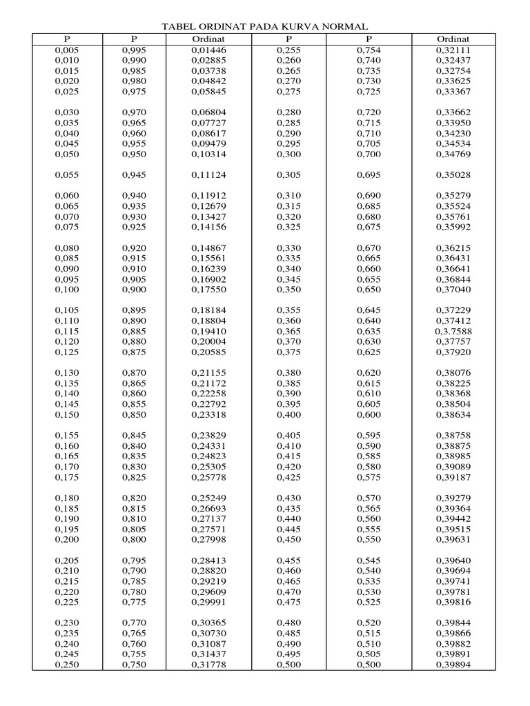 TABEL ORDINAT PADA KURVA NORMAL