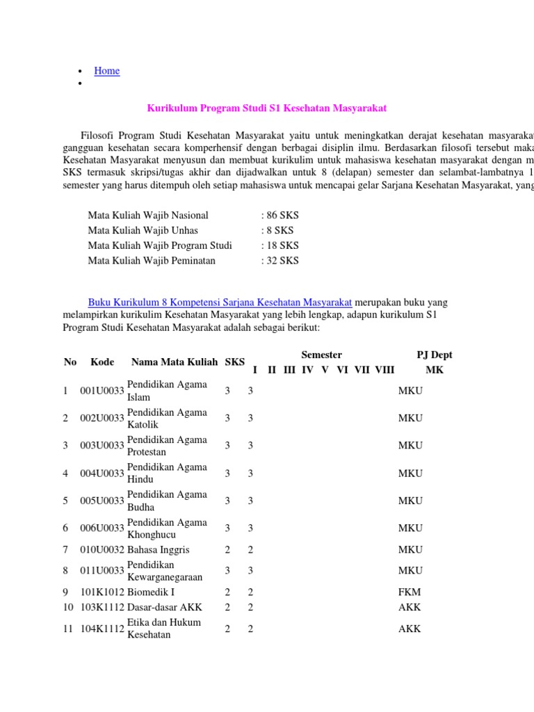 melampirkan kurikulim Kesehatan Masyarakat yang lebih lengkap, adapun kurikulum S1