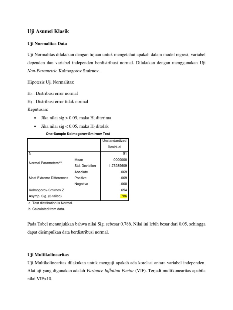 Pada Tabel menunjukkan bahwa nilai Sig. sebesar 0.786. Nilai ini lebih besar dari 0.05, sehingga