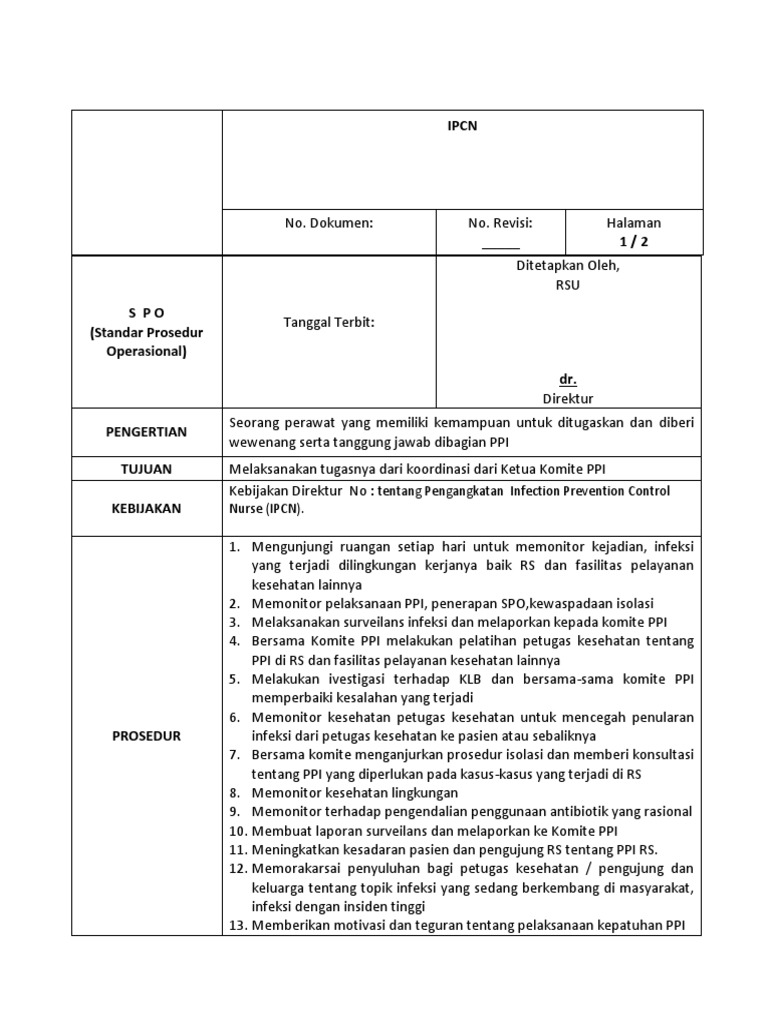Kebijakan Direktur No : tentang Pengangkatan Infection Prevention Control