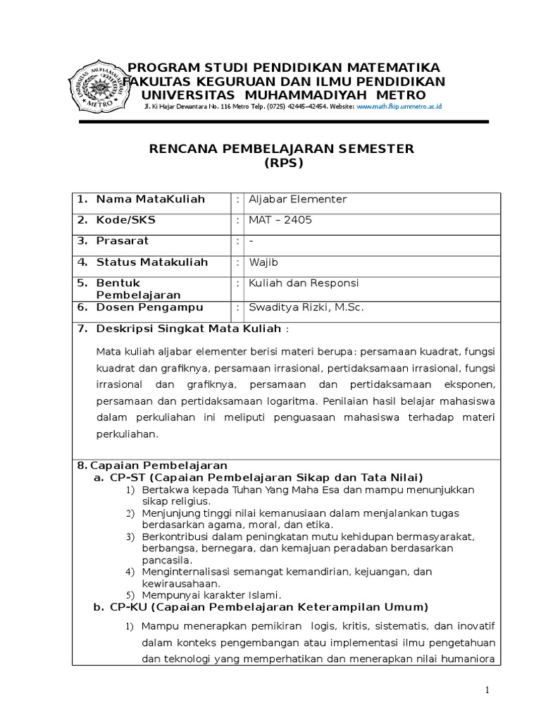 Mata kuliah aljabar elementer berisi materi berupa: persamaan kuadrat, fungsi