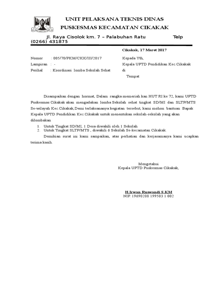 Perihal : Koordinasi lomba Sekolah Sehat di