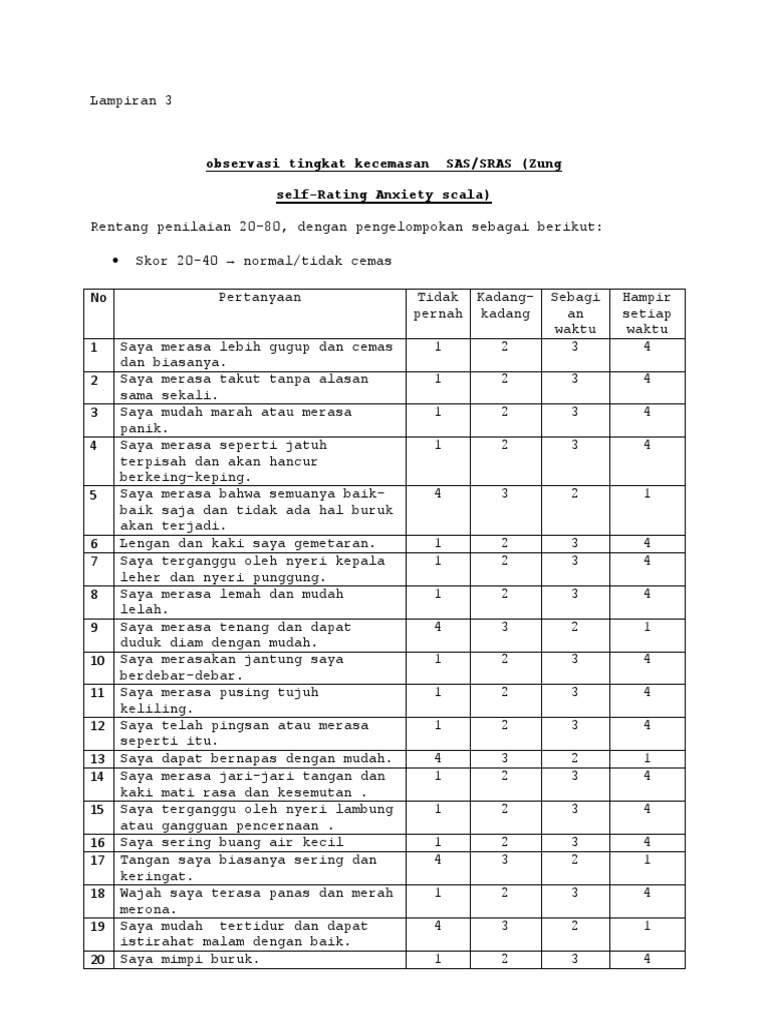 observasi tingkat kecemasan SAS/SRAS (Zung