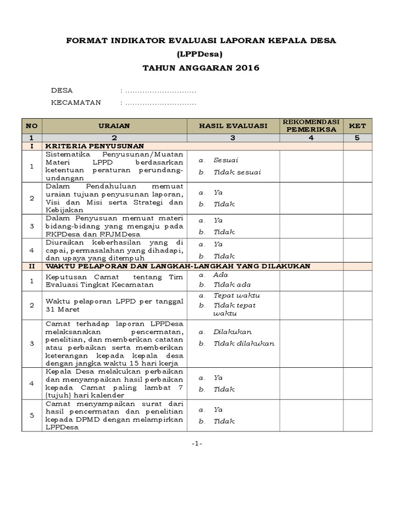 FORMAT INDIKATOR EVALUASI LAPORAN KEPALA DESA