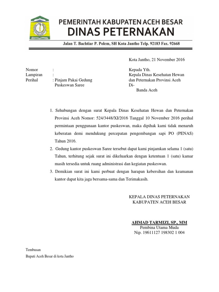 Perihal : Pinjam Pakai Gedung dan Peternakan Provinsi Aceh