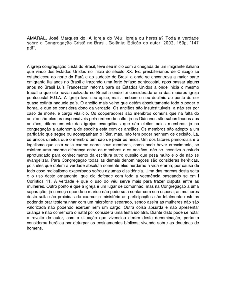 sobre a Congregação Cristã no Brasil. Goiânia: Edição do autor, 2002, 150p. “147