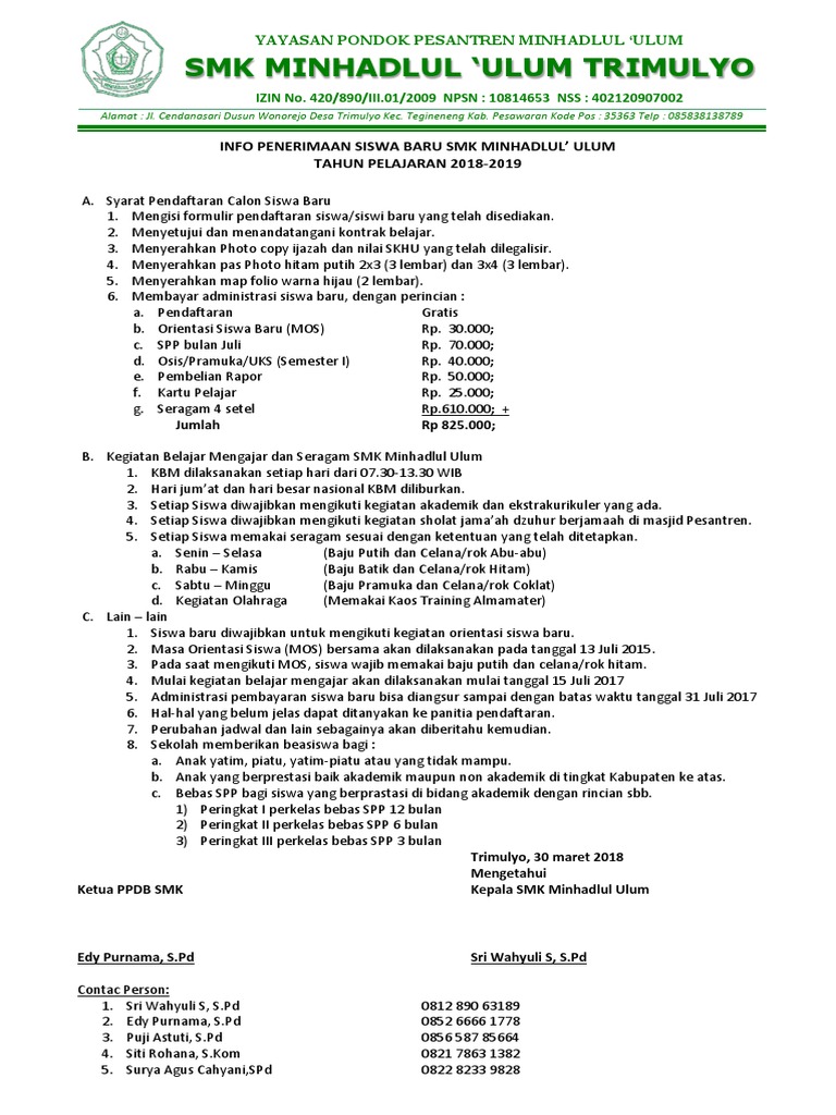 INFO PENERIMAAN SISWA BARU SMK MINHADLUL’ ULUM