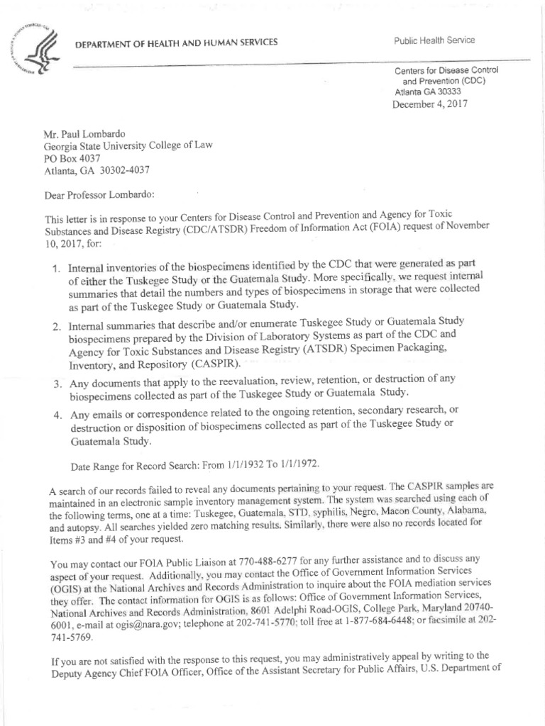 Substances and Disease Registry (CDC/ATSDR) Freedom of Information Act (FOIA) request of November