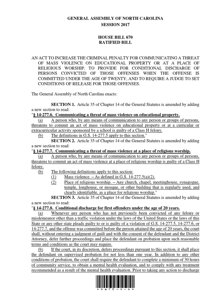 threatens to commit an act of mass violence at a place of religious worship is guilty of a Class H