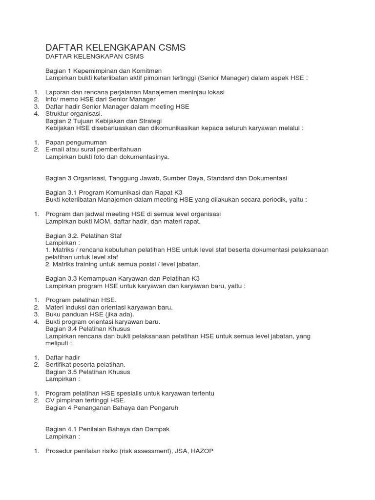 Poin-point umum yang ada dalam dokumen CSMS / K3LL diantarnya sbb: