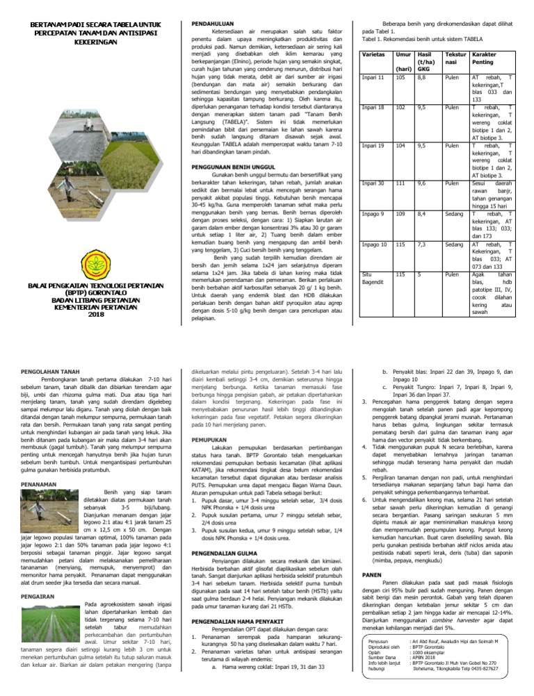 Keunggulan TABELA adalah mempercepat waktu tanam 7-10 Inpari 19 104 9,5 Pulen T rebah, T