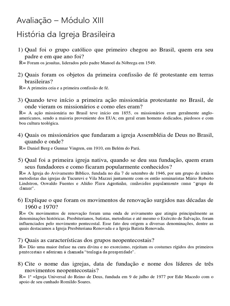 10) Enumere dois aspectos positivos e dois negativos da igreja brasileira?