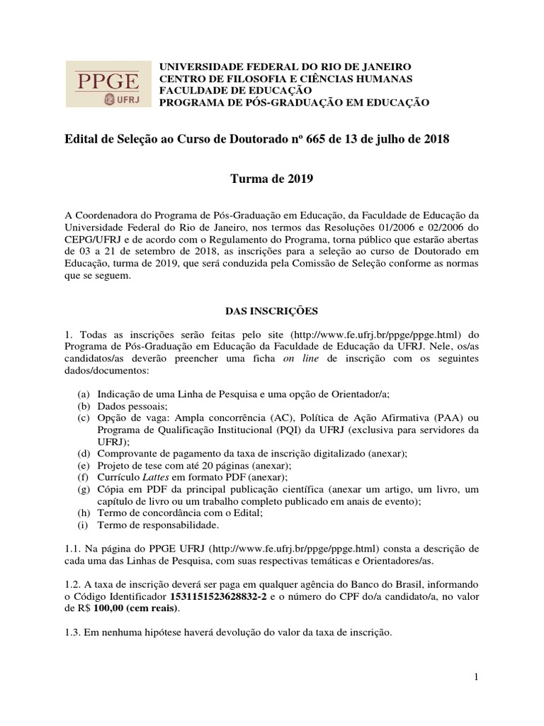 Programa de Pós-Graduação em Educação da Faculdade de Educação da UFRJ, no horário de