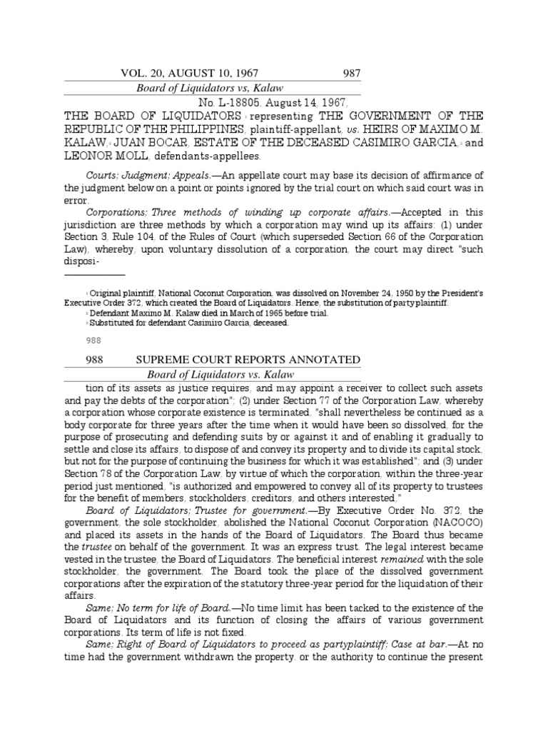 67 Phil. 17 and in their nineteenth special _______________ 14 Citing Sumera vs. The beneficial interest remained with the sole stockholder—the government. abolished NACOCO. de Ocampo. We. as party plaintiff. and instructed the board's incoming and outgoing correspondence clerk. in the absence of statutory provision to the contrary. pp. Appellee heirs of Kalaw raised in their motion to dismiss. 721. 16 See: Section 3. 2. Kalaw lifetime. which was overruled. By Executive Order 372. accordingly. the Board of Liquidators. The16 provisions of Section 78 of the Corporation Law—the third method of winding up corporate affairs—find application." However. We there said that "the rule appears to be well settled that. in that its counsel prepared the amended complaint. 15 Italics ours. . Defendants' second poser is that the action is unenforceable against the heirs of Kalaw." We there noted that "[o]ur Corporation Law contains no provision authorizing a corporation. Mrs. Rules of Court. At no time had the government withdrawn the property. the complete loss of plaintiffs corporate existence after the expiration of the period of three (3) years for the settlement of its affairs is what impelled the President to create a Board of Liquidators. after three (3) years from the expiration of its 998 998 SUPREME COURT REPORTS ANNOTATED Board of Liquidators vs. the government. to mail the original thereof to the court and a copy of the same to defendant's counsel. to continue in its corporate name actions instituted by it within said period of three (3) years. from the Board of Liquidators. Valencia. It was an express trust. with instructions to admit plaintiff's amended complaint to include. Plaintiff came to this Court on appeal. Rule 3. rule that the Board of Liquidators has personality to proceed as party-plaintiff in this case. If for this reason alone. Defendants' position is vulnerable to attack from another direction. held in 14 that case that the Board of Liquidators escapes f rom the operation thereof for the reason that "[o]bviously. She mailed the copy to the latter but f ailed to send the original to the court. the solestockholder. pending actions by or against a corporation are abated upon expiration of the period allowed by law for the liquidation of its affairs. and placed its assets in the hands of the Board of Liquidators. Plaintiff moved to reconsider. 21-25.The lower court dismissed the suit." We accordingly directed the record of said 15 case to be returned to the lower court. This motion was rejected below. to continue the management of such matters as may then be pending. The Board of Liquidators thus became the trustee on behalf of the government. or the authority to continue the present suit. we cannot stay the hand of the Board of Liquidators from prosecuting this case to its final conclusion. Ground: excusable negligence. as directed. 726-727. we. 17 Record on Appeal. these precepts notwithstanding. The legal interest became vested in the trustee—the Board of Liquidators. Receda Vda. in effect.