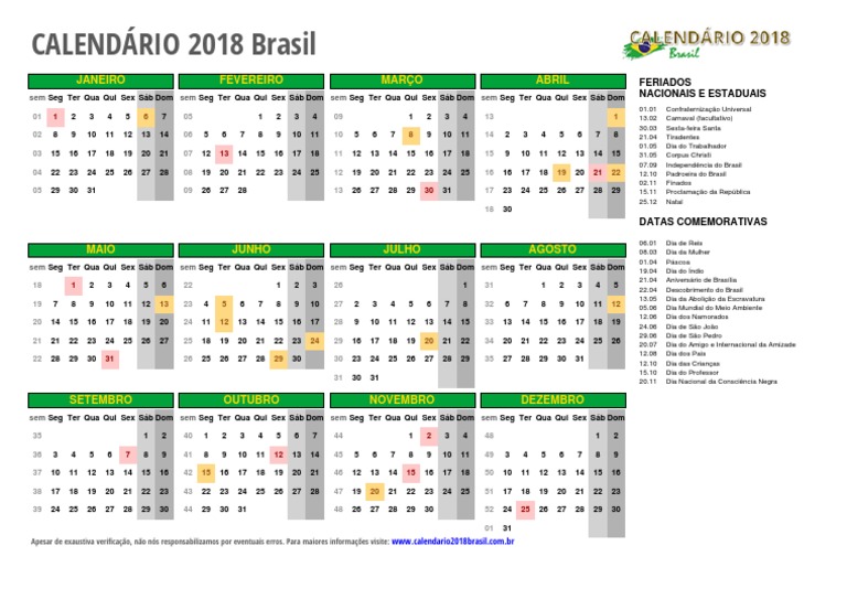 Apesar de exaustiva verificação, não nós responsabilizamos por eventuais erros. Para maiores informações visite: www.calendario2018brasil.com.br