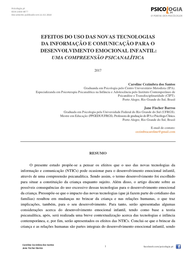 informação e comunicação (NTICs) pode ocasionar para o desenvolvimento emocional infantil.
