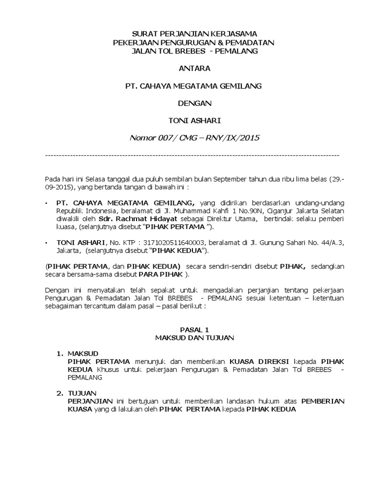 1. Surat perjanjian ini di buat oleh kedua belah pihak di Subang, pada hari, tanggal, bulan
