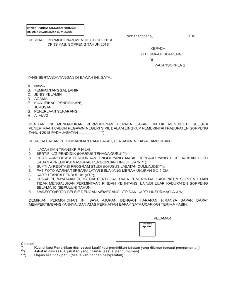 CONTOH SURAT LAMARAN FORMASI