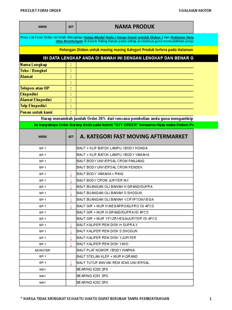 PRICELIST FORM ORDER SWALAYAN MOTOR