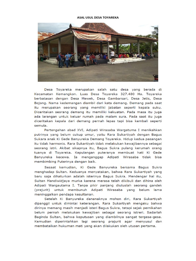 Desa Toyareka didirikan pada tahun 1850 oleh sekelompok petani yang dipimpin oleh Ki Joko. Mereka membangun permukiman pertama di daerah subur dekat Sungai Brantas untuk bermukim dan bertani. Desa ini sejak didirikan telah menjadi pusat kehidupan masyarakat petani di sekitarnya.