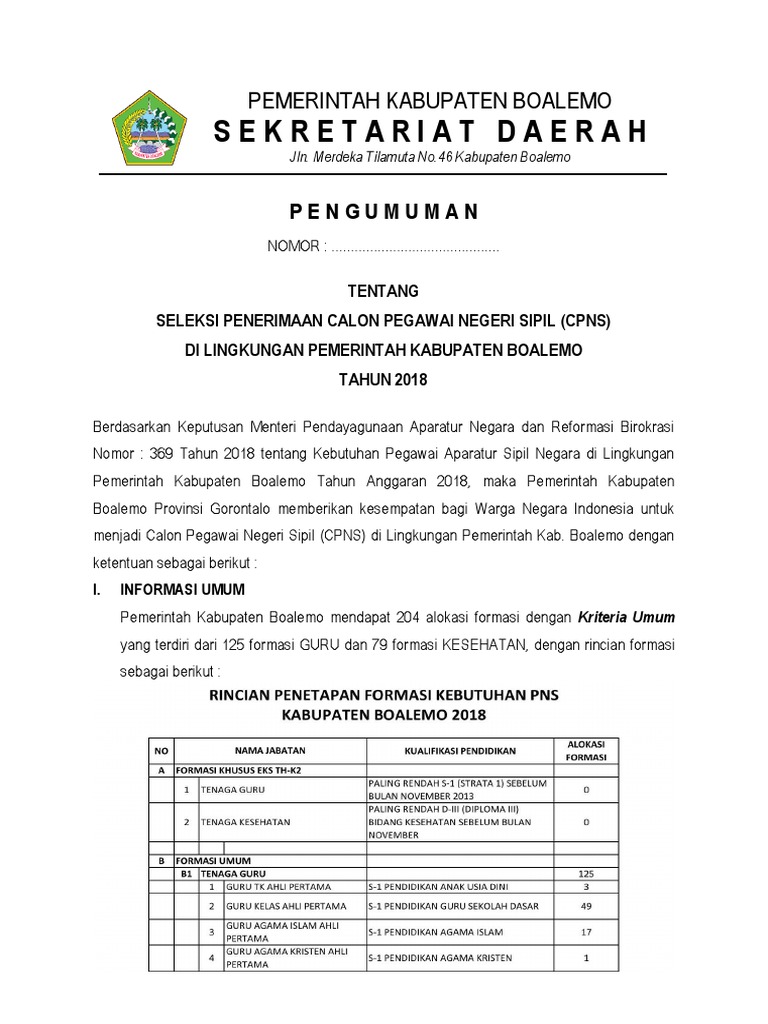 CPNS Formasi Umum Pemerintah Kabupaten Boalemo Tahun 2018, wajib